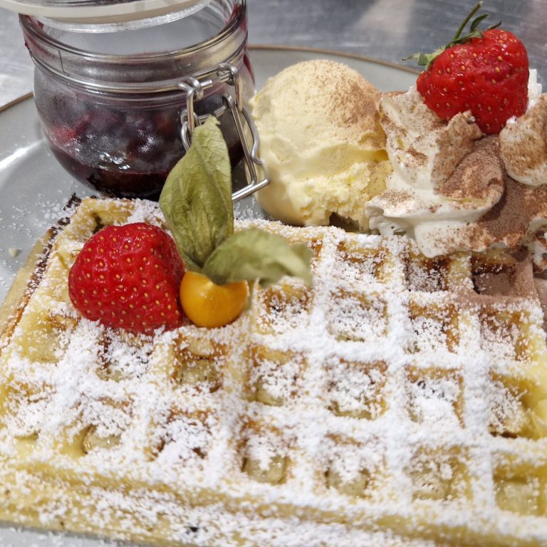 Probieren Sie unsere frischen Waffeln, perfekt als süßer Snack oder Dessert nach einer Mahlzeit.